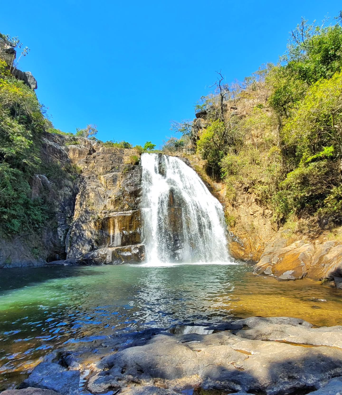 Uma cachoeira de beleza única, oferecendo um cenário espetacular para fotografias e um local perfeito para se banhar.