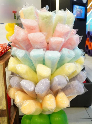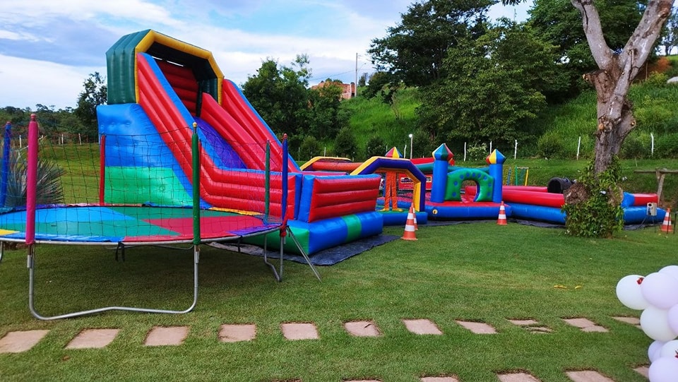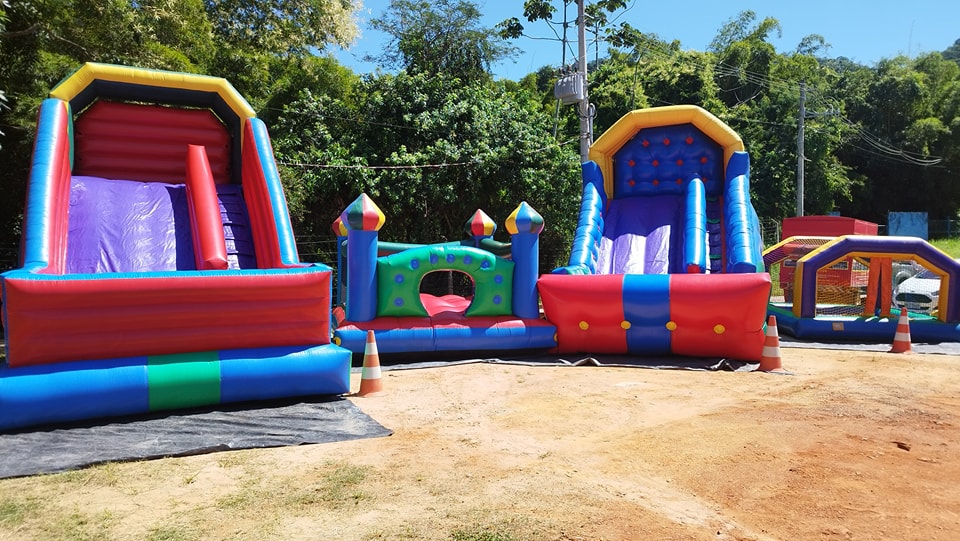 algodão doce, pipoca, churros, touro mecânico, escorregador, piscina de bolinhas, pula-pula e castelo pula-pula